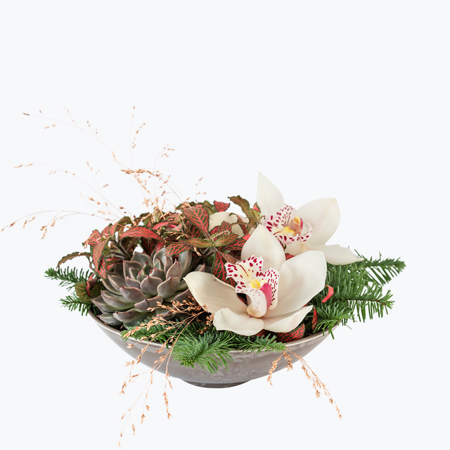 En holdbar dekorasjon til med nydleige orkider som blikkfang . En perfekt gave å gi i adventstiden da den gleder lenge.